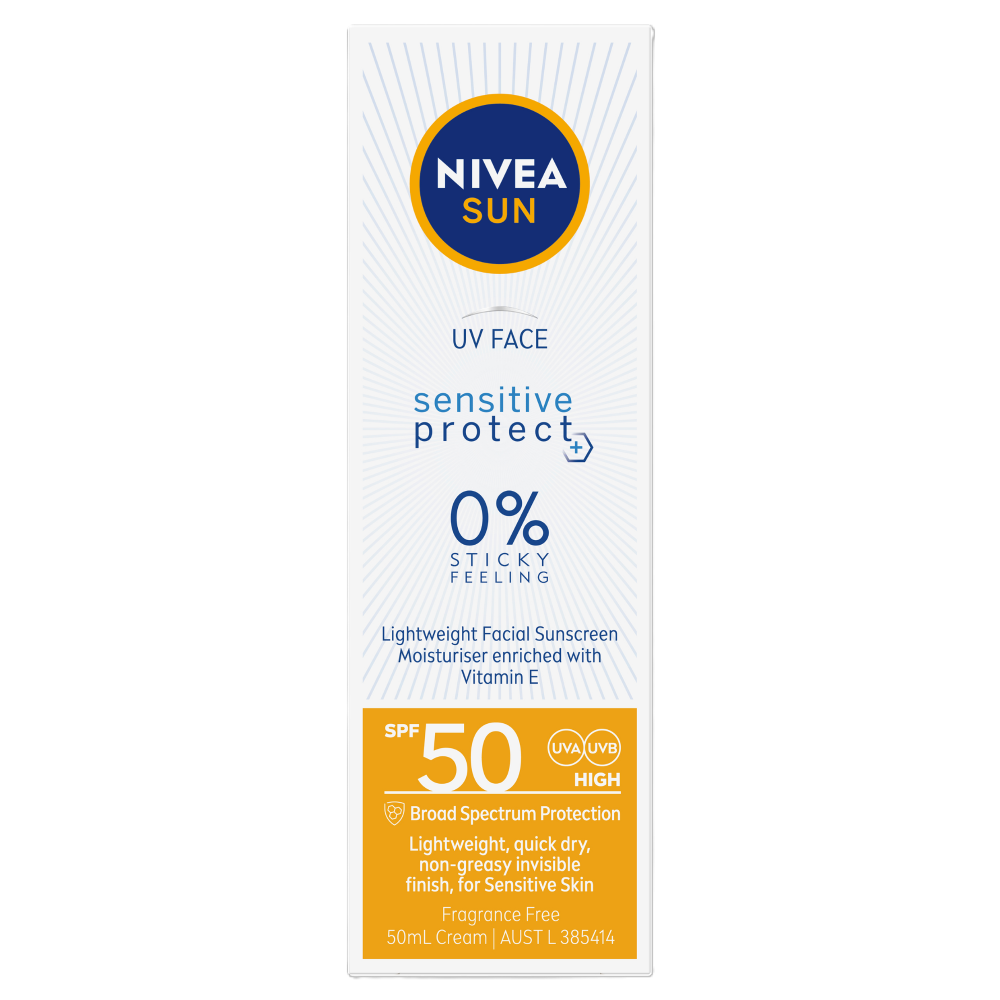 NIVEA Sun UV Face Sensitive Protect SPF50 is especially developed for sensitive facial skin. Formulated for those with sensitive skin, this light-weight, non-greasy and non-sticky facial sunscreen absorbs quickly, protects against UVA and UVB rays and offers BROAD SPECTRUM SPF50 protection. The light feel texture provides a dry touch surface, making it ideal for everyday use and easy make up application. Enriched with Vitamin E, an antioxidant to help hydrate, repair and protect your skin. Dermatologically tested and suitable for those with sensitive skin. NIVEA – protection that cares for your skin! The skin compatibility of this facial sunscreen has been dermatologically approved. Made in Australia.