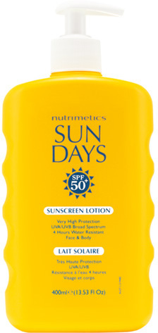 Nutrimetics Sun Days SPF 50+ Sunscreen Lotion is a light, non-greasy sunscreen for the face and body. It has a matte, non-stick finish, so even sand won’t adhere to it. The 4-hour water resistant formula contains vitamin E to moisturise skin and protect it from environmental damage, and aloe vera to soothe. The convenient pump dispenser has a locking mechanism for easy transport. The sunscreen is suitable for the whole family.