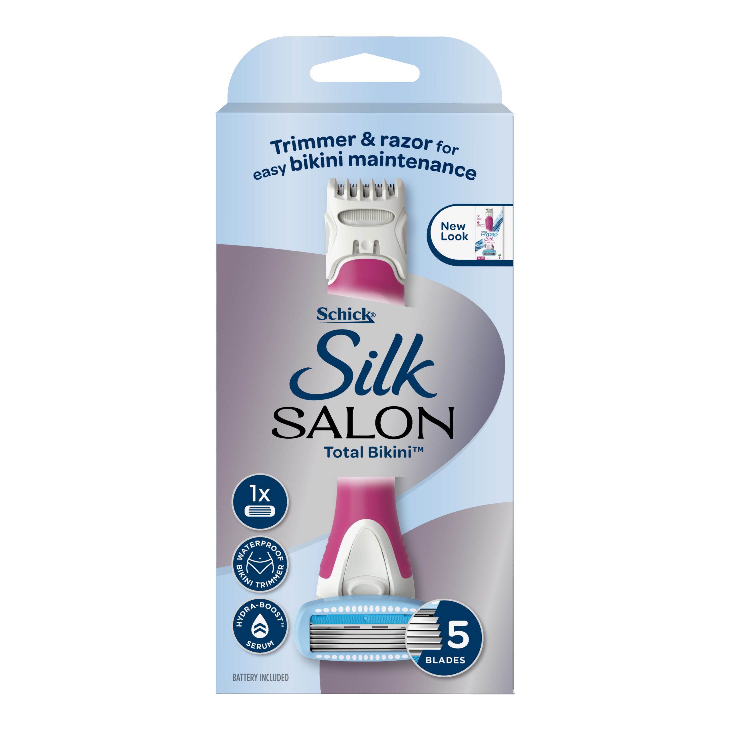 Schick™ Hydro Silk TrimStyle Kit +5 includes a hydrating* razor and bikini trimmer in one! On one end the razor is formulated with water-activated Hydra-Renew™ serum with shea butter. This moisturising serum is clinically proven to provide lasting hydration for up to 2 hours after shaving. The other end is a waterproof bikini trimmer that can be used in or out of the shower for convenient bikini maintenance. Combining the uniquely designed Schick Hydro Silk razor with advanced trimming technology, this razor shaves, trims, and transforms with just the flip of a handle. *Moisturises up to 2 hours after shaving.