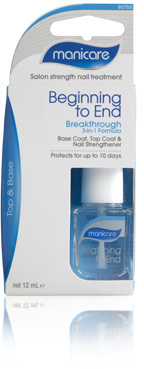 Manicare Beginning to End is an advanced formula that combines three-products-in-one! Base Coat to guard against staining by forming a colour gripping surface, a top coat to seal in nail colour, preventing chipping and peeling, and lastly a nail strengthener that creates a protective shield, instantly building thicker, stronger nails. Formaldehyde and toluene free.