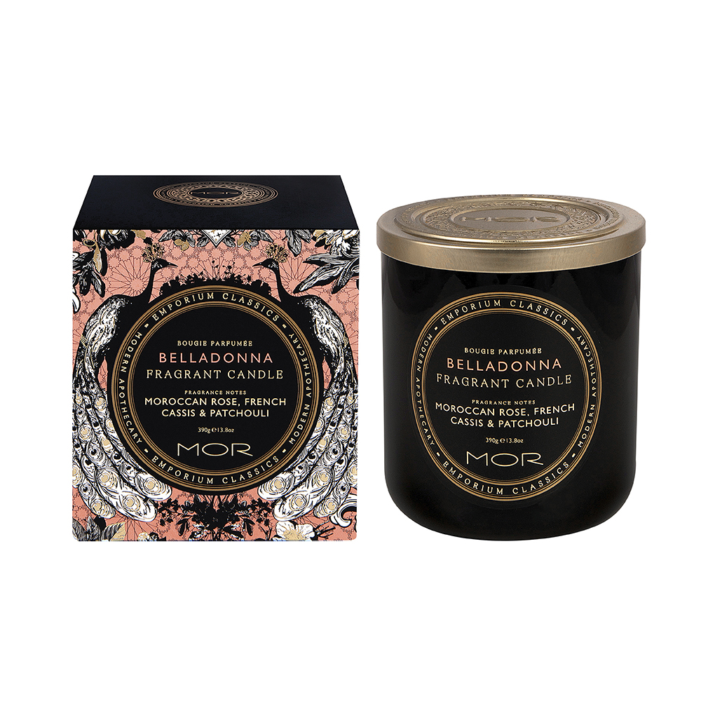 MOR Emporium Classics Fragrant Candle in Belladonna is a black soy wax candle that is hand poured into a black glass vessel. The classic fragrance candle features an adorned lid and a 100 per cent cotton lead-free wick. It burns for up to 60 hours. The candle features a belladonna fragrance.