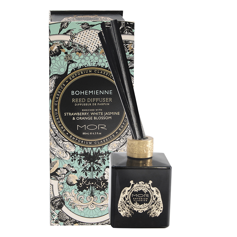 MOR Emporium Classics Reed Diffuser – Bohemienne is a luxury home fragrance set. It contains an embellished Black Glass Flacon, stylish Black Reeds and blissful Diffuser Fragrance to perfume the air with a signature scent and add style to any space. The oil based formula allows a stronger scent throw and better performance on the diffuser and rattan reed sticks allows the fragrance oil to travel up the reed and efficiently fragrance the room. Available in five fragrances. This product is not tested on animals.