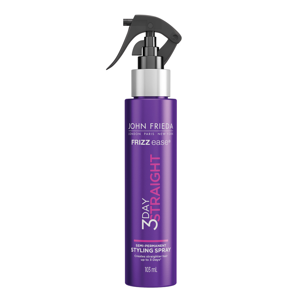 John Frieda Frizz-Ease® 3-Day Straight™ Semi-Permanent Styling Spray is a styling spray that will transform thick, curly, frizzy hair into straight smooth style. It is an at home alternative to salon keratin treatments. The semi-permanent straigtening solution gives women with coarse curly hair at home access to a coveted styling treatment offering a lasting smoothing effect, the heat-activated, semi permanent styling spray is ideal for women with coarse, unmanageable curls or waves who struggle to achieve and maintain straight style. The weightless spray provides heat protection as it blocks out frizz and enhances straightening results, locking in sleek, glossy texture for up to three days. The formula contains a blend of polymers with keratin protein wraps each strand seals in straight style as it smoothes. Spray through damp hair, combing to distribute. Blow dry hair straight first, finish by flat ironing hair in sections to preserve hair for three days or until your next shampoo.
