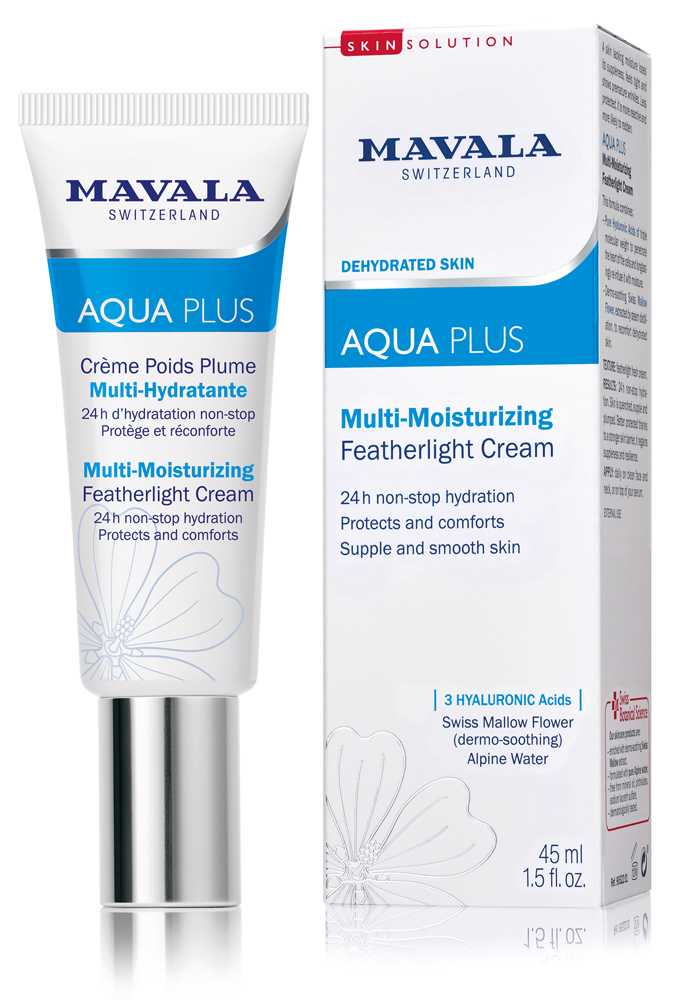 Mavala Switzerland MAVALA SWISS SKIN SOLUTION AQUA PLUS Multi-Moisturizing Featherlight-Cream is a lightweight cream for protecting, soothing and 24 hour non-stop hydration. Concentrated in pure hyaluronic acids of three different molecular weights, it penetrates all epidermal layers of the skin to intensely re-infuse it with moisture. Particularly rich in dermo soothing swiss mallow flower extract, it also helps skin regain comfort and suppleness. Apply over the Multi-Moisturising Intensive Serum as a day and/or night cream. Paraben free.