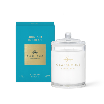 Glasshouse Fragrances Midnight in Milan – Saffron & Rose Soy Candle is a candle inspired by after all the popping flashes stop, dresses unzip and heels come off. Saffron and amber mixed with rose comes from somewhere, and you giggle and run for what’s next in the night. It’s the end of the runway, and the real beginning of Milan. Top: saffron; middle: rose; base: moss, dry amber, musk. Fragrance strength: 4.