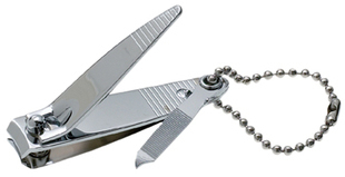 Chrome Plated nail clippers with a nail file and key chain. Clip or trim nails to the desired length before shaping with an emery board or nail file to prevent chipping or splitting.