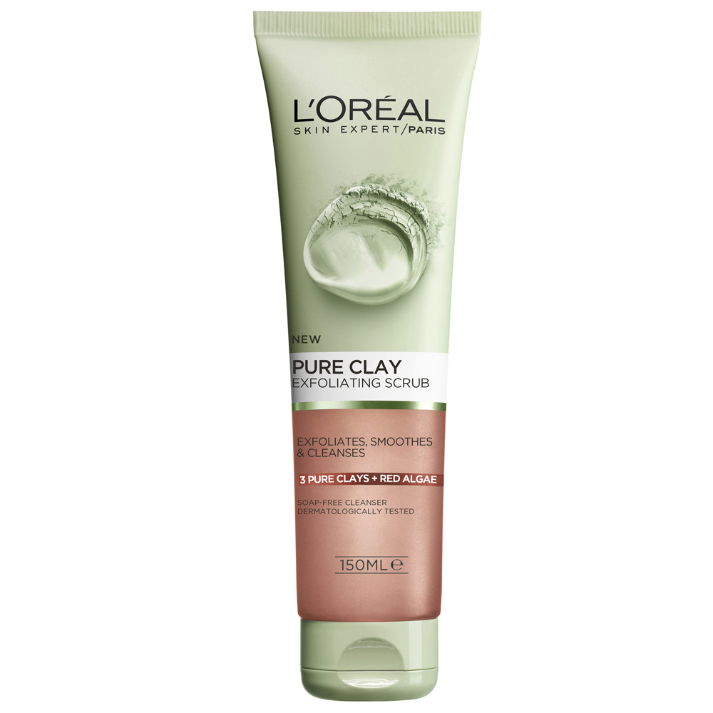 L’Oréal Paris Pure Clay Cleanser Exfoliating + Smoothing Red Algae Scrub Wash is a clay cleanser enriched with red algae extract, known for its brightening properties. Finely milled apricot seeds gently exfoliate dull, uneven skin to reveal skin’s natural glow. The beaded, creamy texture illuminates by exfoliating skin, without drying it out.