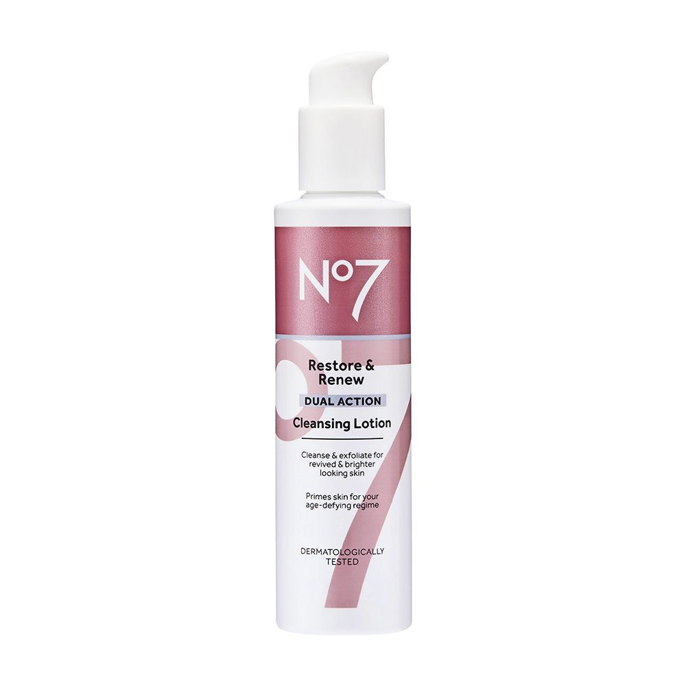 No7 Restore & Renew Dual Action Cleansing Lotion cleanses and exfoliates for revived and brighter looking skin. For best results, using a cotton pad or your fingers, sweep over your skin, avoiding the delicate eye area and wipe or rinse way with warm water. Use as the first step of your morning and evening age-defying regime and follow with your No7 Restore & Renew Serum and Moisturiser.