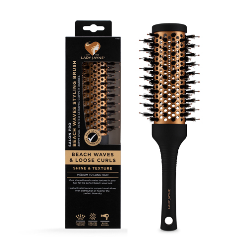 Lady Jayne Salon Pro Beach Waves Brush is a 48mm Oval Vented Ceramic Copper Barrel Styling Brush to create the perfect beach waves look. The unique oval shaped barrel creates textures in your hair while the heat activated ceramic copper barrel allows the even distribution of heat for the perfect blow-dry.