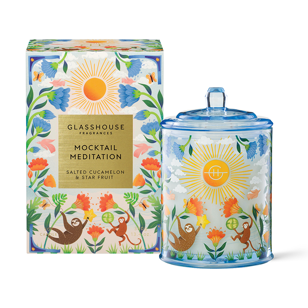 GLASSHOUSE FRAGRANCES Mocktail Meditation Soy Candle is a candle part of the limited-edition Summer Refresh Collection. A refreshing fragrance of salted cucamelon (a hybrid of melon and cucumber), star fruit, and a base of musk, cedar, and amber. Fruity and zesty, without being too sweet, just like the perfect mocktail. Top notes: green grass, green leaves, star fruit, sugar melon, cucamelon; middle notes: marigold, blue lotus, peony, sea salt; and base notes: musk, cedar, white woods, amber.