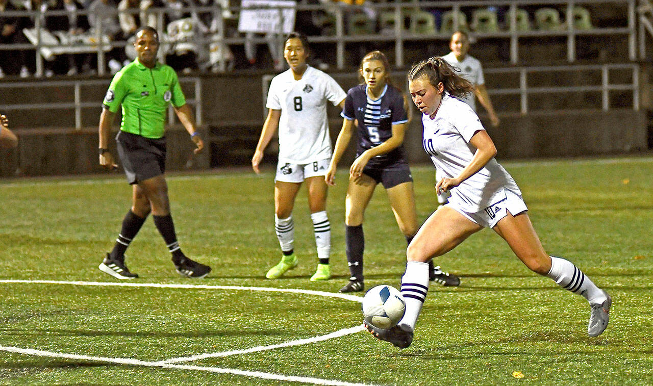 With the Hawks keeping four defenders packed tightly in formation to thwart Peninsula striker Millie Long, another Port Angeles product, Kyrsten McGuffey, sparked the Pirates early in the second half.