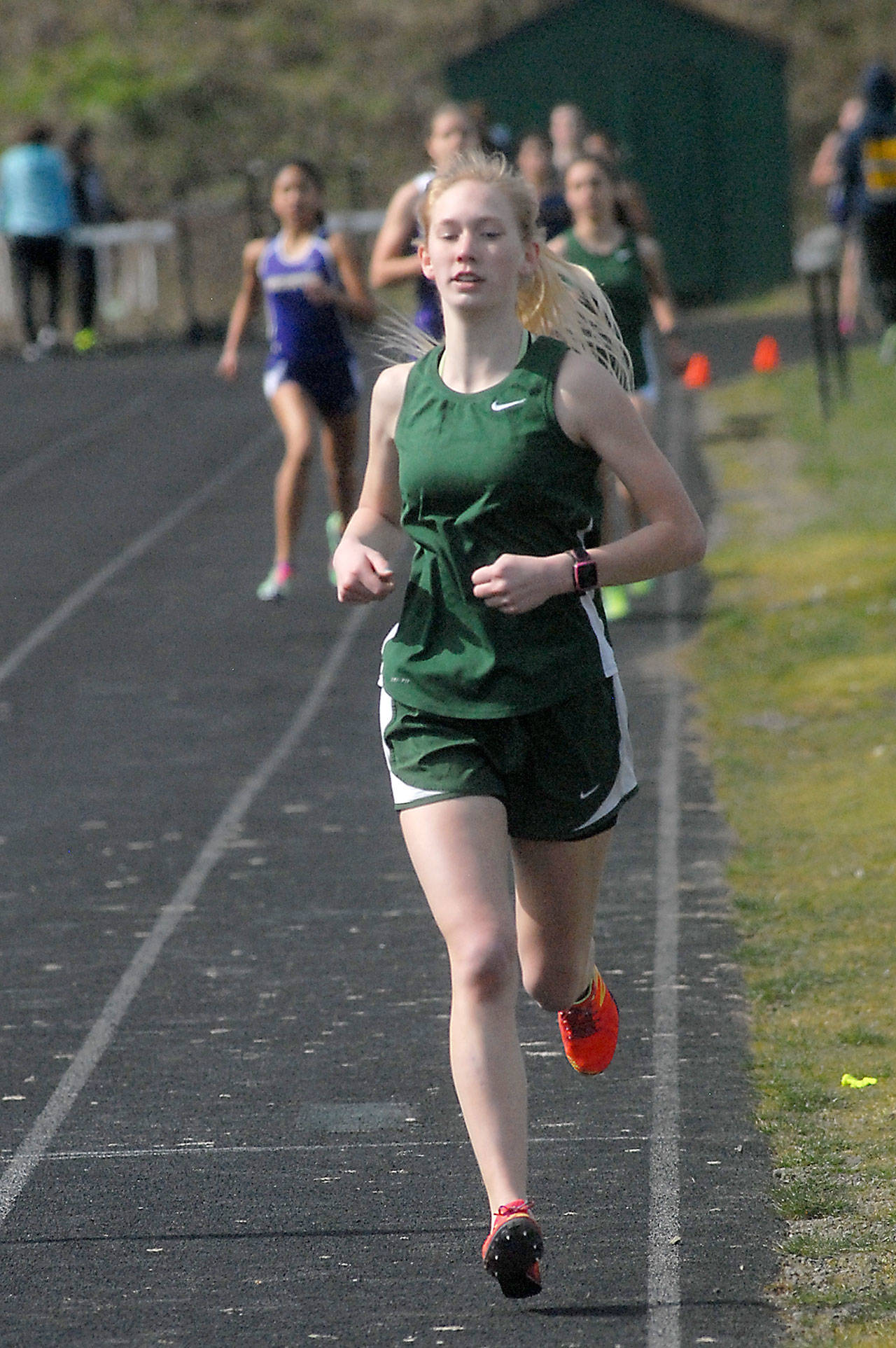 “Maddie was the designated varsity runner. They both ran together the whole race averaging 93-second laps and then both ran a 77-second last lap and the straight-a-way duel was really thrilling. Neither would give in and they traded leads all the way. A classic,” said Port Angeles track coach Rob Sheedy