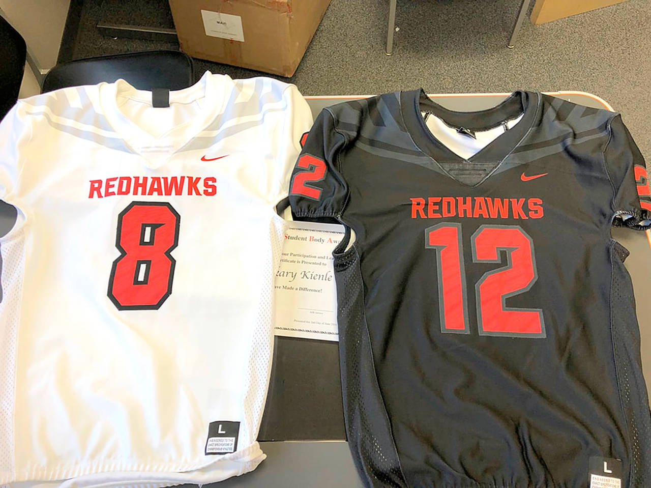Away jerseys are white with the same red “Redhawks” script and numbers.
