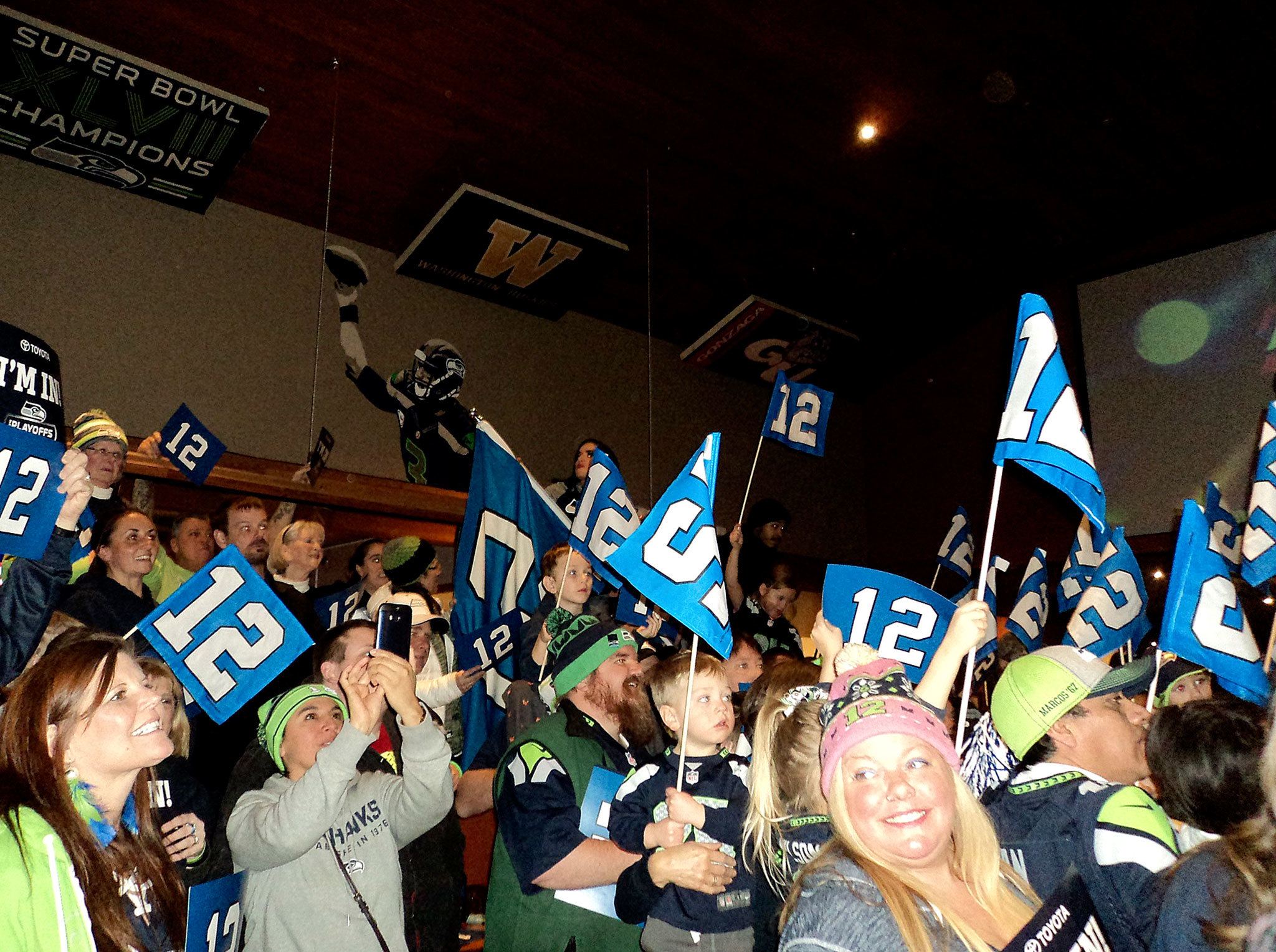 Patient Seahawk fans were rewarded Wednesday night when DJ Supa Sam with the Seattle Seahawks and former Sea Gals Jessia Irwin and Gelly Liro visited Fanaticus in Port Angeles to rally fans for the Hawks’ playoff game Saturday against Detroit. Seahawks representatives also traveled to Forks Wednesday and have been going “up and down the whole [Washington] coast,” said Supa Sam.DJ Supa Sam brought the giant “12” flag that comes out of the tunnel at CenturyLink Field and fans received little “12” flags and Seahawk placards.