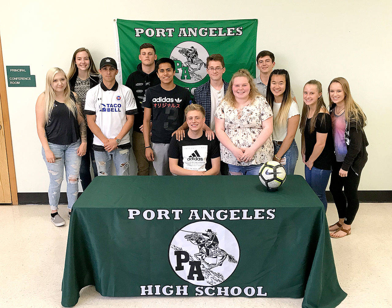 Below, Port Angeles soccer player Ben Schneider, center sitting, signs his letter of intent Wednesday to play soccer for Peninsula College surrounded by friends and fellow Roughrider soccer players. Schneider was a first-team all Olympic League 2A player this year for the Riders and was the 2017 Peninsula Daily News All-Peninsula boys’ soccer MVP.