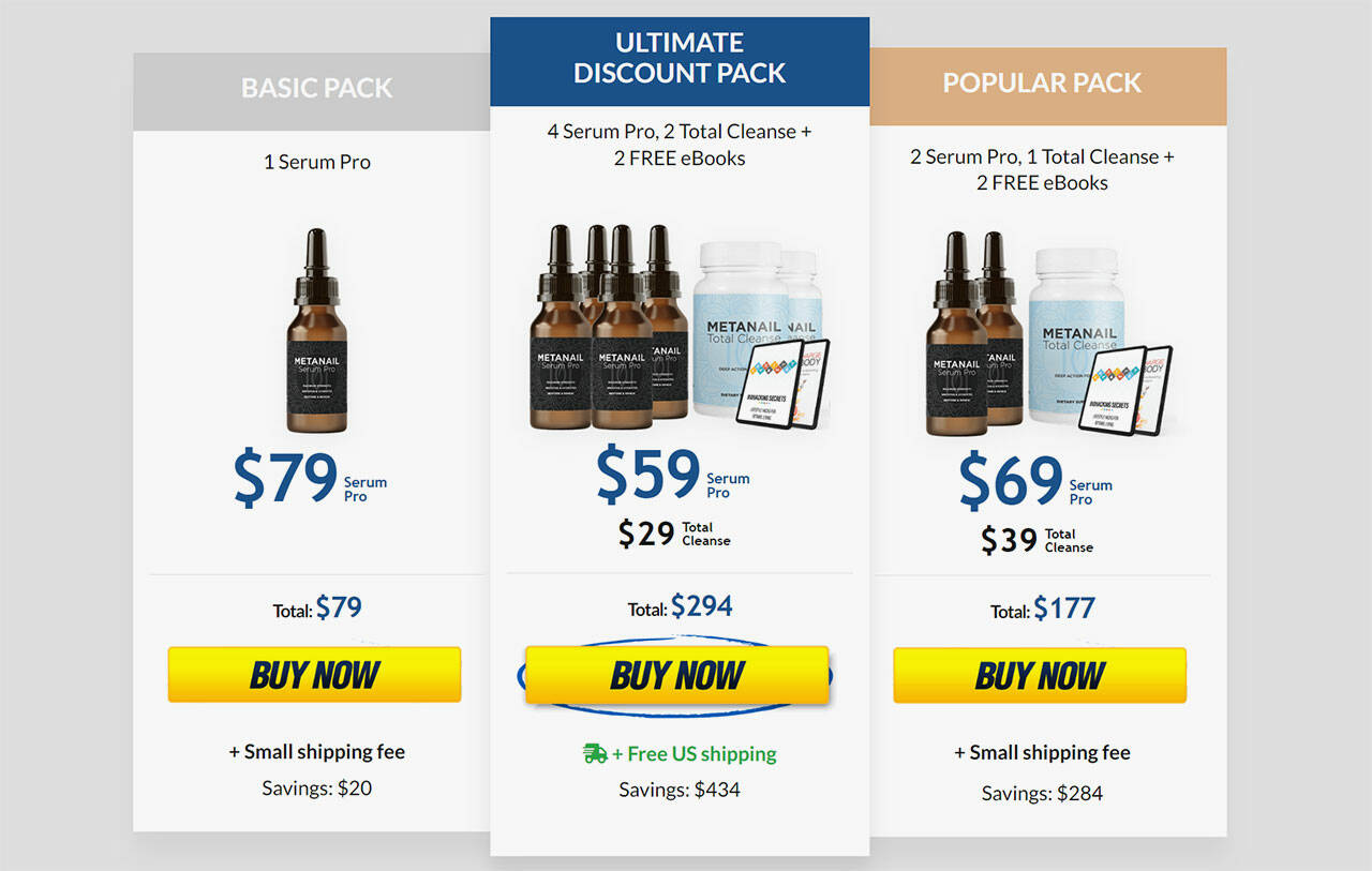 - Ultimate Discount pack: 4 Metanail Pro Serum bottles retail at $59.00 per bottle + 2 Total Cleanse for $29.00 each ($294 total) + free U.S. shipping (saving $434). Comes with two free eBooks.